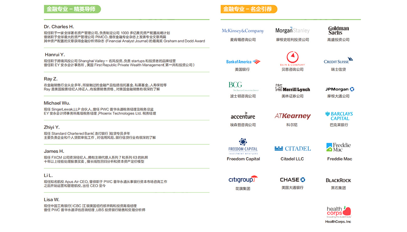 | 飞鹰计划 | 利用涵盖全美各行业的强大资深导师资源库,飞鹰计划保证每一位优秀的留学生获得美国专业实习经历,帮助学生开拓国际视野、增强专业素养、提升个人综合竞争力,为将来的美国求职铺平道路。 | 怀揣名企梦想、希望毕业后获得在美实习及工作经验、及希望长期留美工作的在读本科生、研究生。每名参加飞鹰计划的学生需通过全方位评估。 |